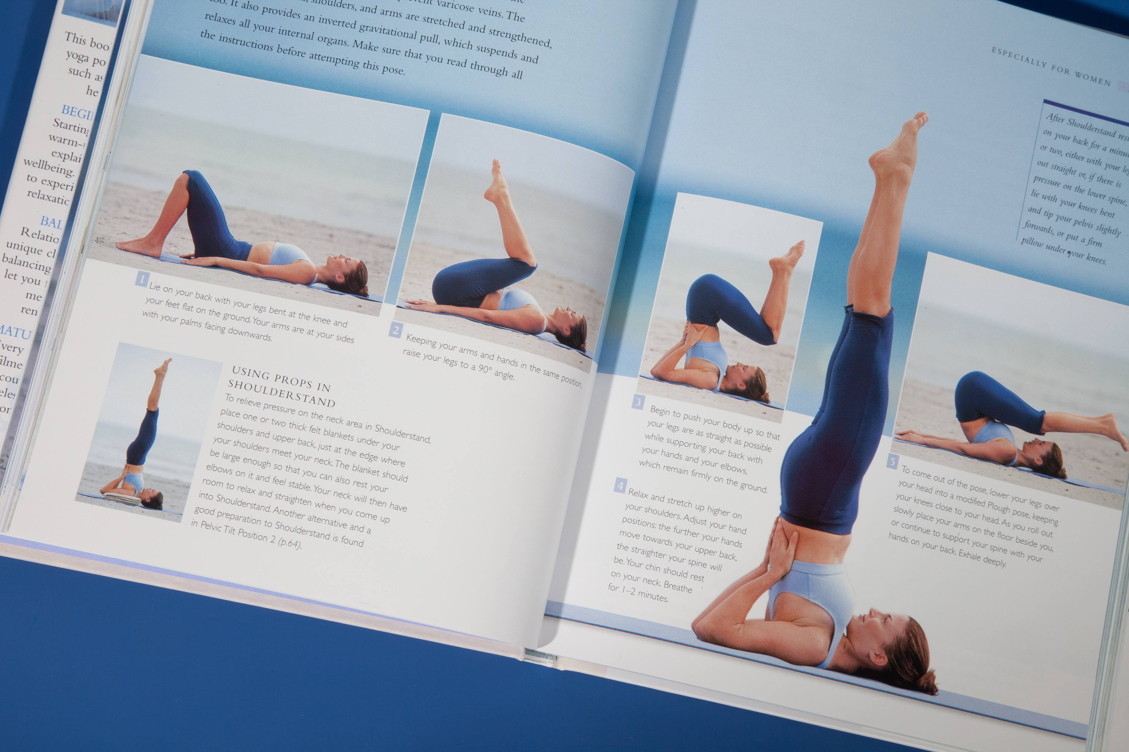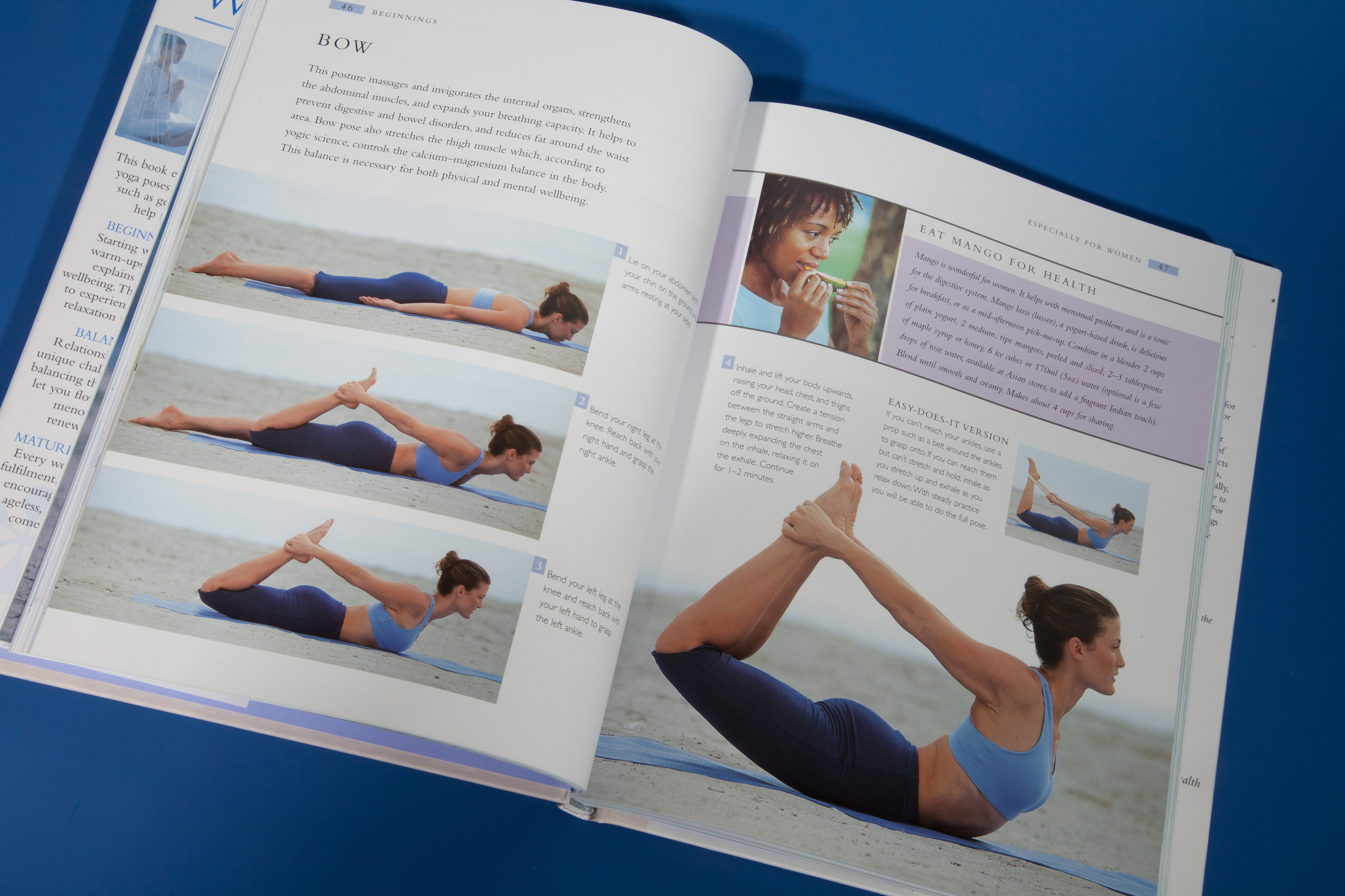 Layout designs for 'Yoga for Women' by Shakta Kaur Khalsa, a DORLING KINDERSLEY book. As the author says, 'Yoga and women go together like tea and toast: it's a cosy, homey fit'.